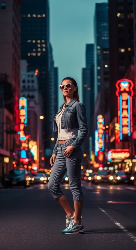 Denim-style capri pants paired with a sporty top and sneakers create a mix of casual and athletic. It’s unique, practical, and perfect for everyday wear.