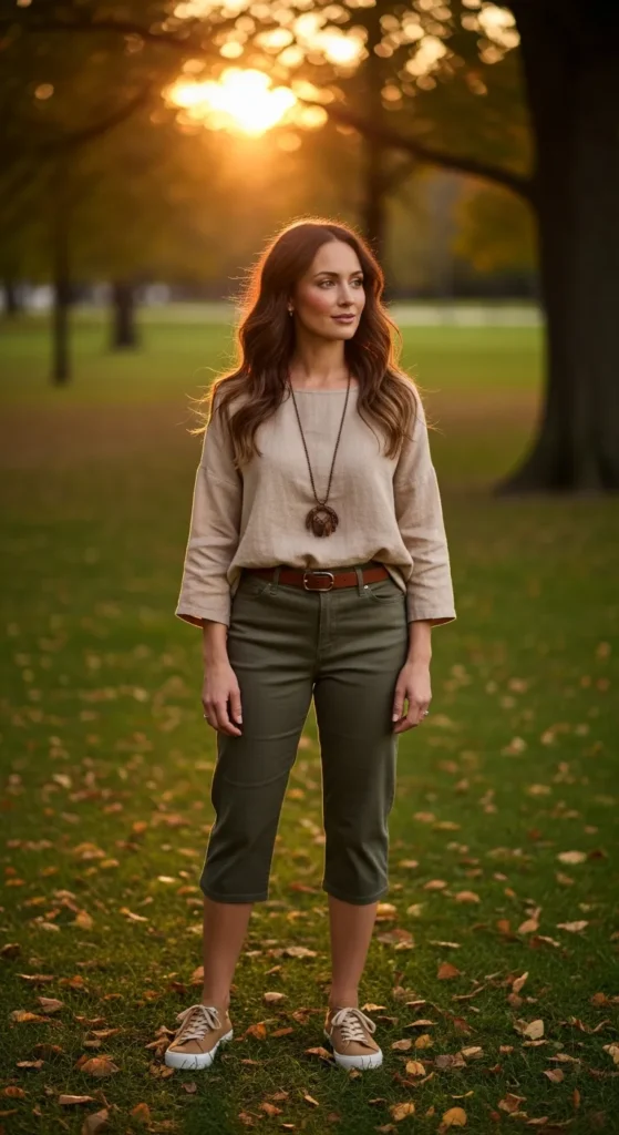 Olive or brown capri pants styled with a neutral top and sneakers create a grounded, nature-inspired look. It feels calm, warm, and subtly stylish.