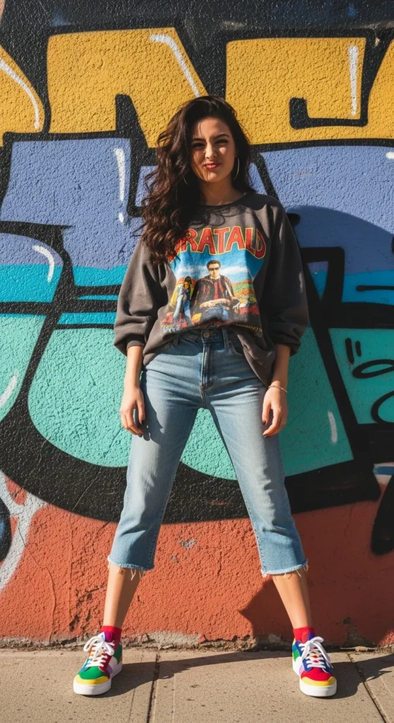 Capri pants paired with a bold graphic sweatshirt and sneakers create a fun, expressive outfit. It’s youthful, relaxed, and perfect for casual outings.