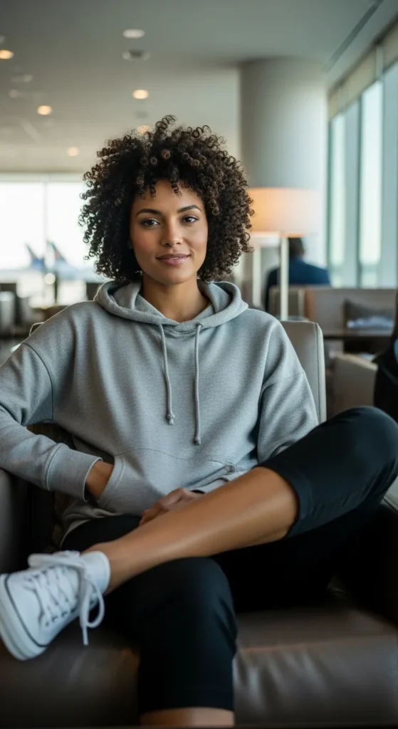 A relaxed hoodie with fitted capri pants and sneakers gives ultimate comfort while still looking styled. Perfect for off-duty days or travel.