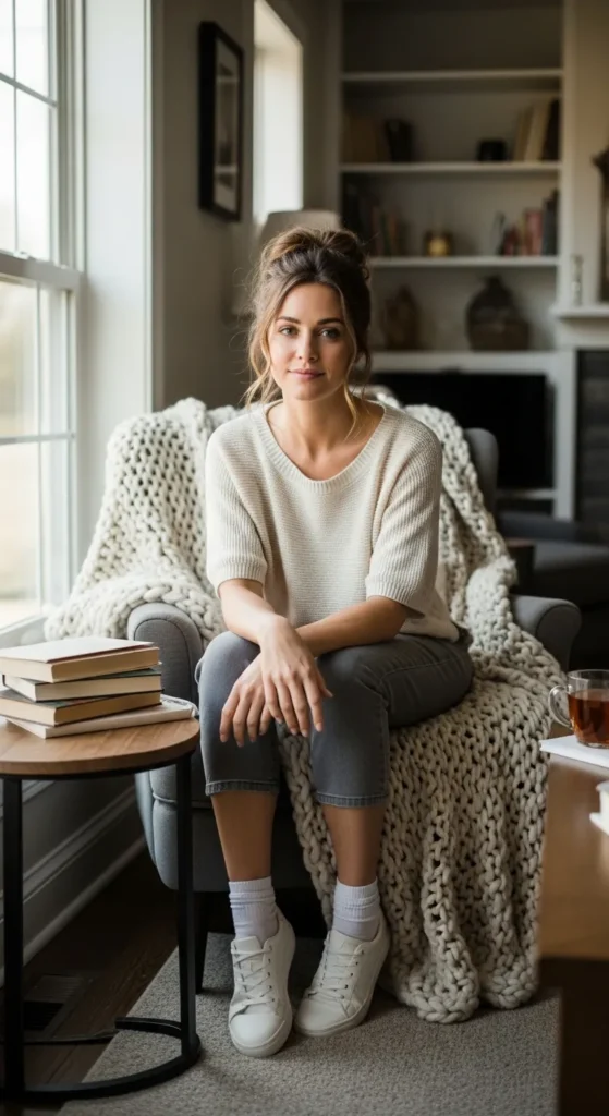 A soft knit top with capri pants and sneakers feels cozy without being heavy. It’s ideal for transitional weather and looks effortlessly put together.