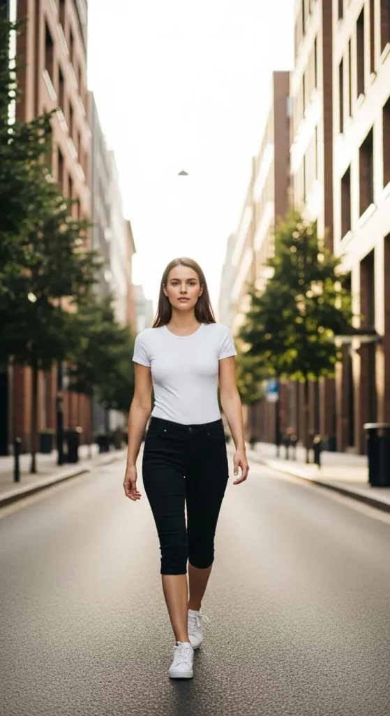 A clean white fitted tee tucked into black capri pants with simple sneakers creates a timeless sporty look. It’s effortless and universally flattering without trying too hard.