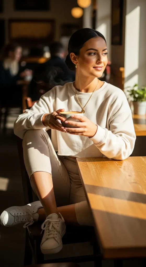 A beige fitted capri paired with a relaxed cropped sweatshirt and crisp white sneakers creates a calm, grounded look. It feels easy, breathable, and perfect for slow mornings or coffee runs with a hint of quiet confidence.