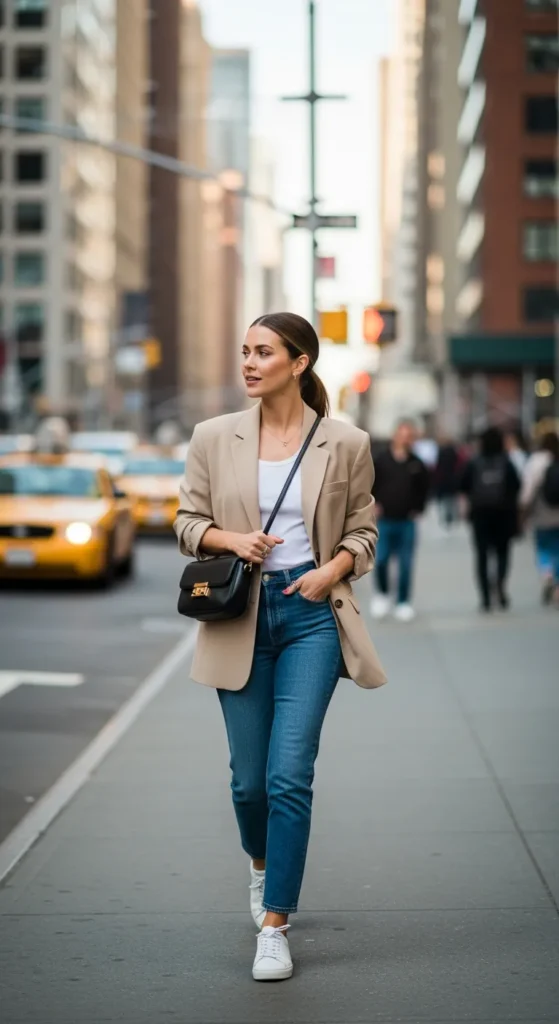 Stylist Suggestion: Add loafers and a sleek low ponytail. The blazer sharpens the casual base, making it instantly elevated.
