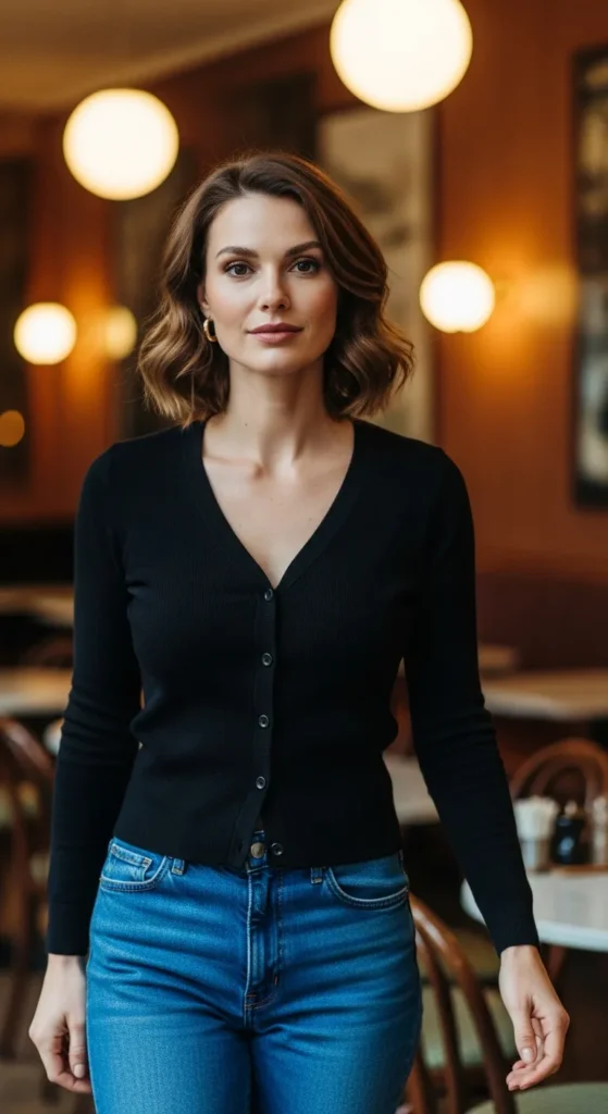 A black fitted cardigan worn as a top with straight denim creates a clean, slightly vintage-inspired minimalist look that feels quietly confident.