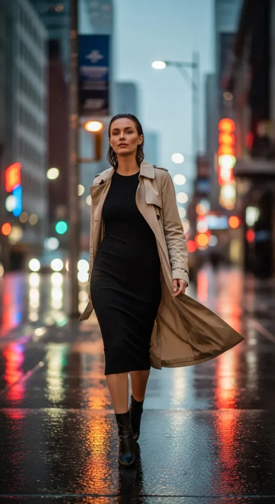 A ribbed black midi dress layered under a beige trench coat feels timeless and structured. It’s the kind of outfit that makes even a simple walk feel like a runway moment.