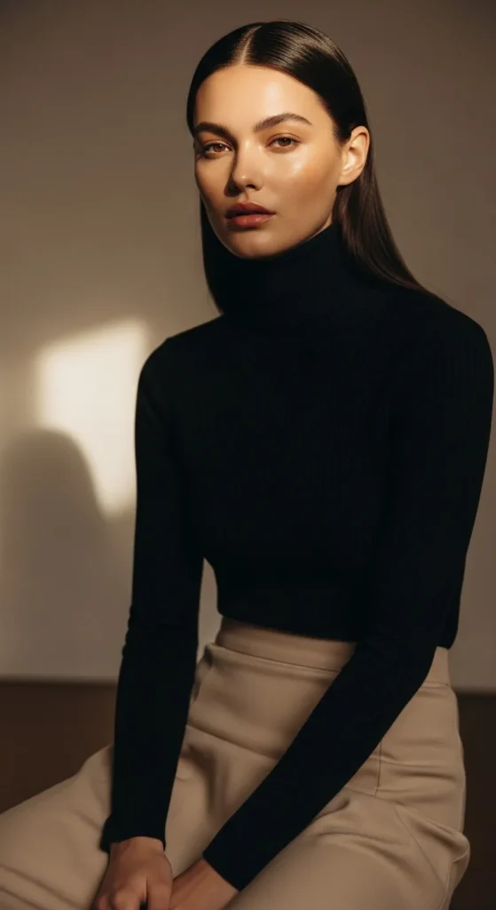A fitted black turtleneck with a flowing beige midi skirt feels classic, soft, and quietly elegant.