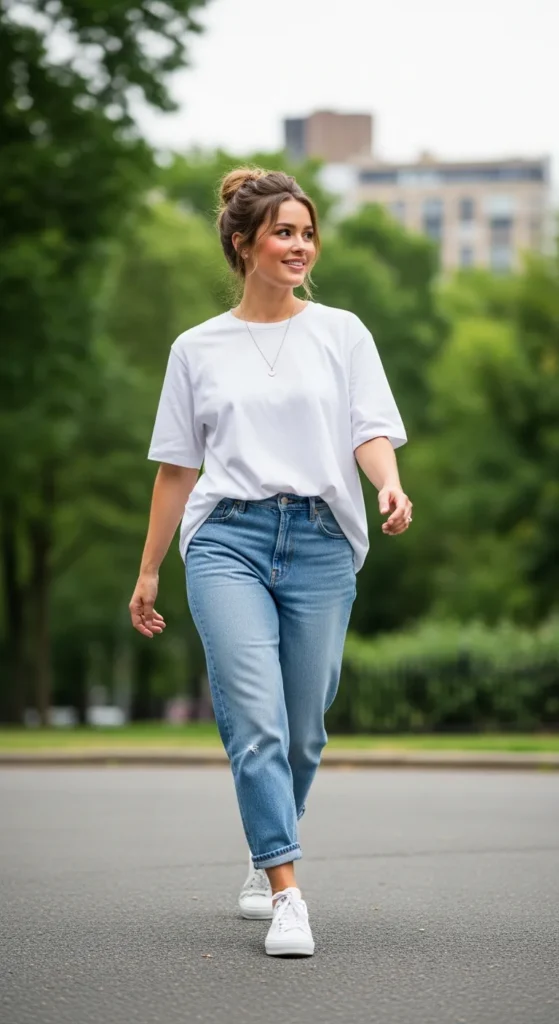 An oversized white tee tucked loosely into light wash jeans is the definition of relaxed minimalism. It feels like weekends, slow mornings, and comfort that still looks styled.