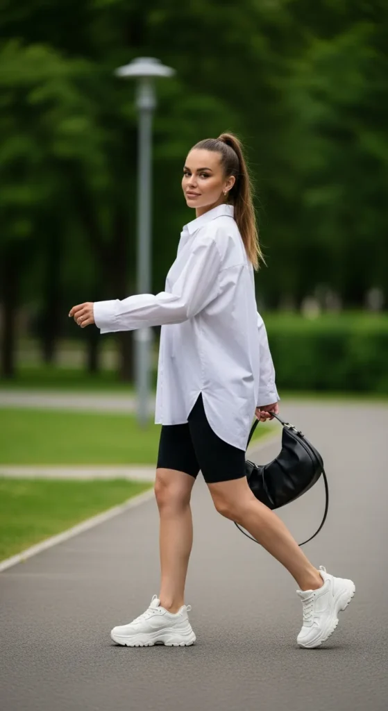 A white oversized shirt layered over black cycling shorts feels relaxed, modern, and slightly sporty in a clean minimalist way.