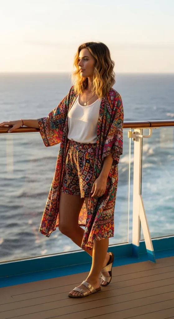 Layering a kimono over a simple tank and shorts instantly elevates a basic outfit into something more styled and travel-ready.