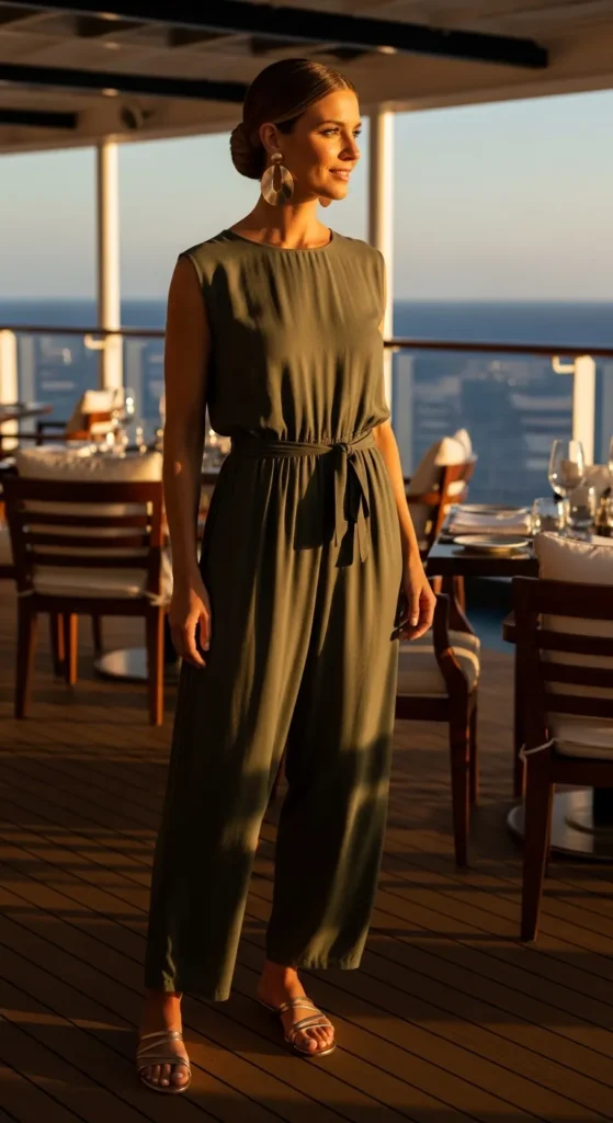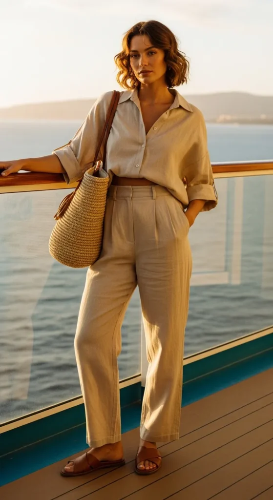 Matching linen sets feel intentional yet completely effortless. A loose top and flowy shorts or pants create a breathable, stylish silhouette perfect for warm cruise days.