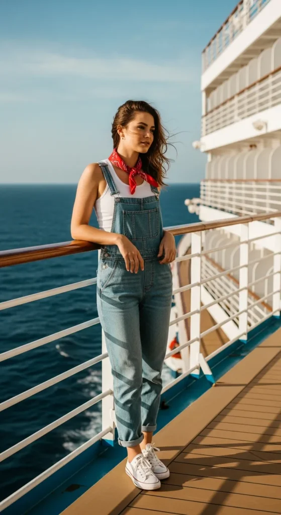 Denim overalls paired with a simple tank offer a youthful, carefree vibe. Perfect for casual exploring days onboard or ashore.