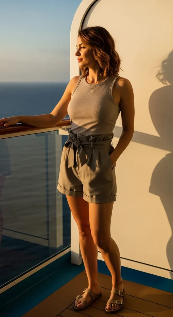 A lightweight button-up shirt paired with relaxed-fit shorts creates an easygoing yet polished cruise look. Slightly tucked or worn open over a tank, this outfit feels fresh, breathable, and effortlessly chic for daytime lounging.