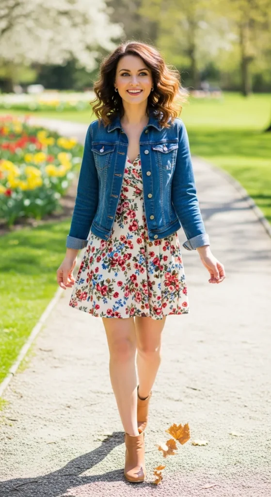 A structured denim jacket over a floral mini dress balances sweetness with a hint of edge. This combination feels playful, youthful, and perfect for spontaneous outings.