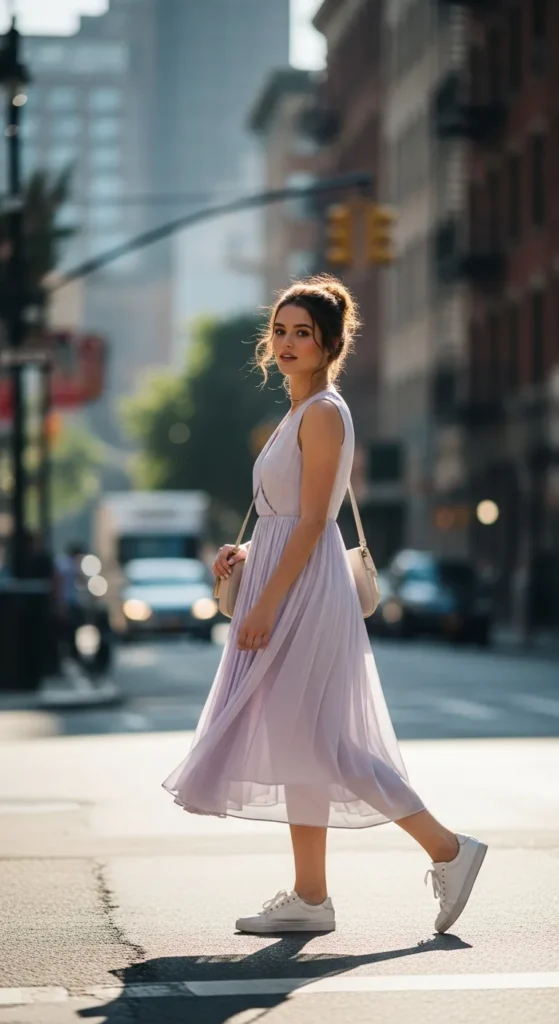A breezy midi dress with subtle movement paired with clean white sneakers blends femininity with comfort. It’s ideal for coffee strolls or museum dates where you want ease without sacrificing charm.