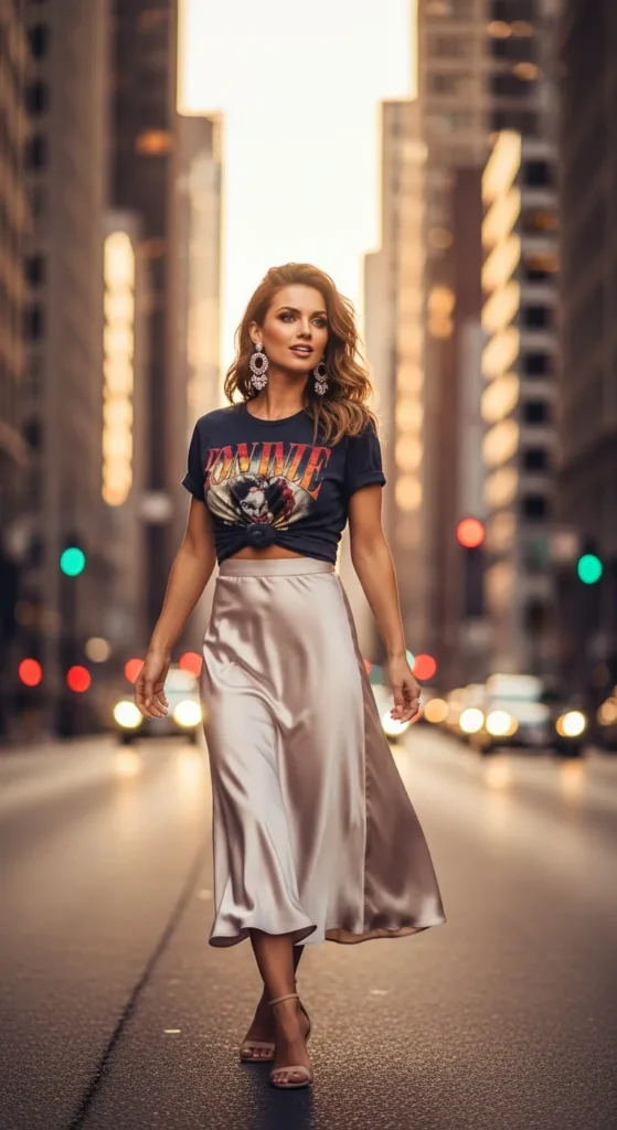 A casual graphic tee tucked into a silky satin skirt creates a playful mix of textures. It feels expressive and slightly edgy while still maintaining a soft, romantic undertone.