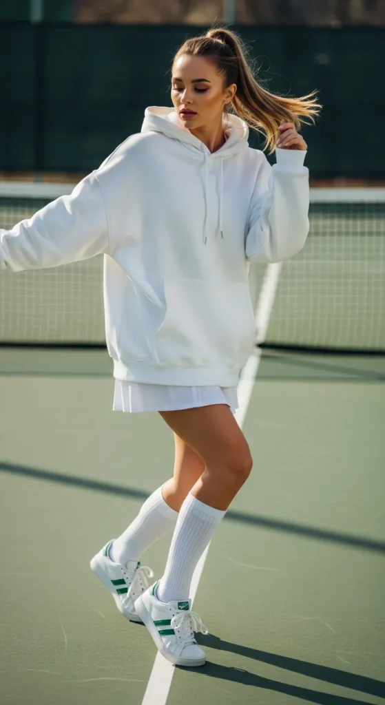 A cozy hoodie paired with a tennis skirt creates a playful mix of sporty and feminine. It’s relaxed yet lively, perfect for casual outdoor meetups.