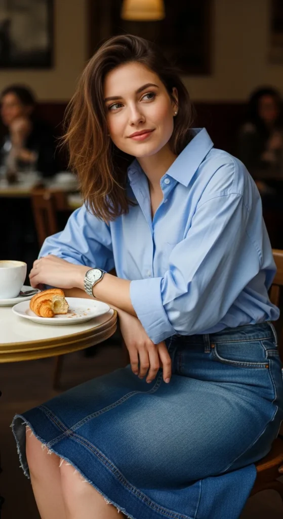 An oversized shirt tucked slightly into a structured denim skirt creates a playful contrast between loose and fitted. It’s casual but carries a hint of effort that feels charmingly intentional.