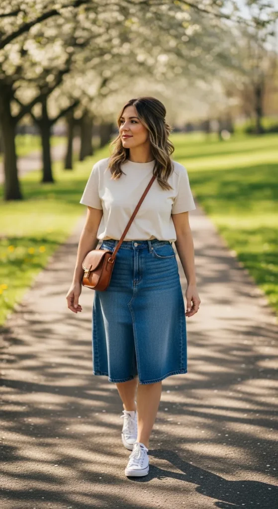 A boxy tee tucked into an A-line skirt creates a playful yet casual silhouette. It feels youthful, comfortable, and perfect for spring days filled with movement.