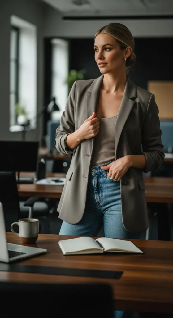 A relaxed blazer layered over a soft tank creates an easy everyday look that still feels sharp. It’s ideal for casual workdays or moments when you want subtle polish.