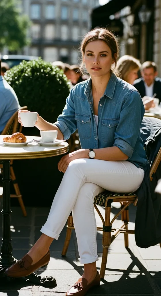 A chambray shirt paired with white jeans feels fresh and clean for spring. It’s casual, timeless, and works effortlessly for daytime plans and casual social moments.