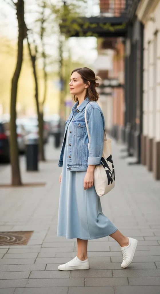 A simple cotton dress layered with a denim jacket is a timeless spring combination. It feels youthful, practical, and comforting perfect for days when you want to look nice without planning too much.