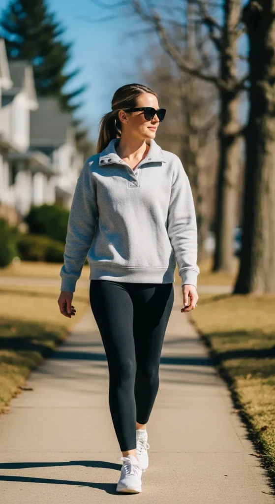 A lightweight pullover with leggings is perfect for relaxed spring days. It feels cozy, simple, and practical while still looking intentional enough to step out confidently.