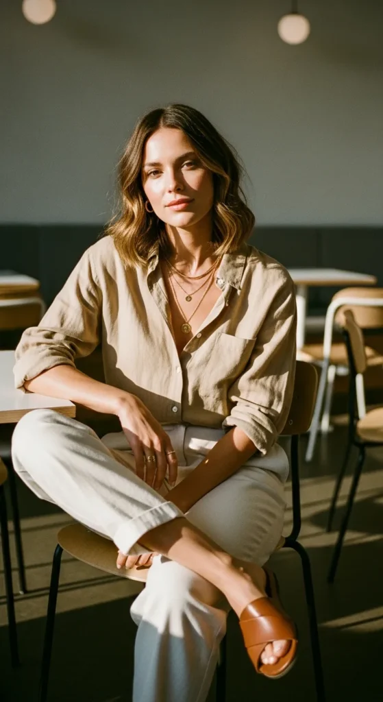 Stylist Suggestion: Keep the shirt slightly unbuttoned and add layered necklaces. This adds softness and dimension to the clean lines, making the outfit feel lived-in rather than stiff.