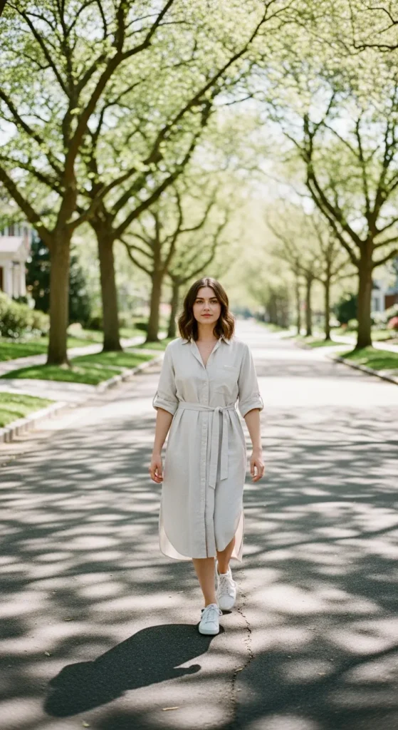 A longline shirt dress worn loose feels breathable and effortless for spring. It’s an easy outfit that moves well and works for both relaxed mornings and casual afternoons.