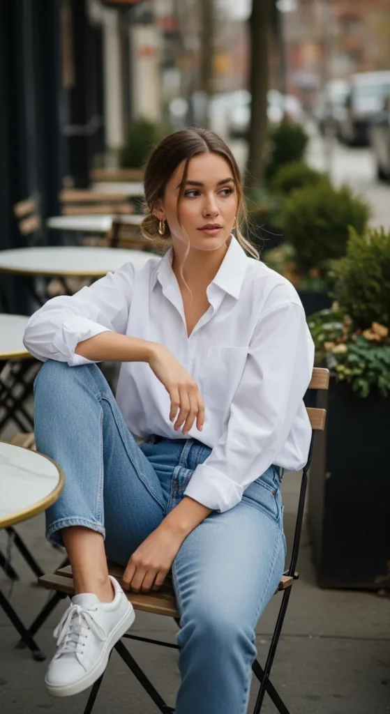 Stylist Suggestion: Roll the sleeves loosely and add slim gold hoops with white sneakers. The relaxed sleeves soften the structure, while simple jewelry keeps the outfit polished but still very everyday.