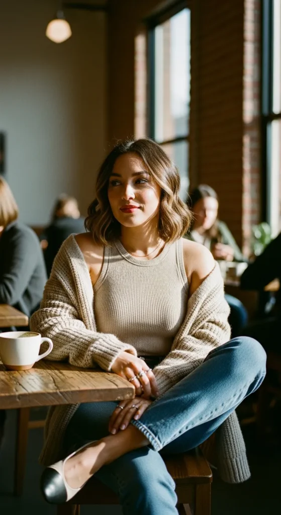A ribbed tank layered under a loose cardigan creates an easy, cozy look that still feels fresh for spring. It’s ideal for unpredictable weather and long days that start cool and end warm.