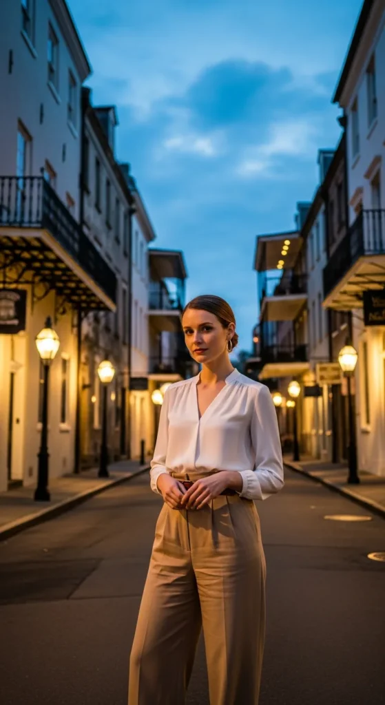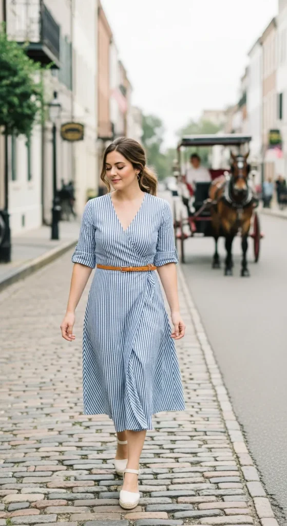 Stylist Suggestion: Pair this with delicate pearl studs and nude block heels. Pearls echo Southern elegance while block heels handle cobblestones comfortably, keeping the look graceful yet practical.
