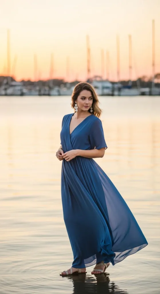 A flowing coastal blue maxi dress mirrors Charleston’s harbor waters. It moves gracefully in ocean breezes and feels dreamy during sunset harbor views.