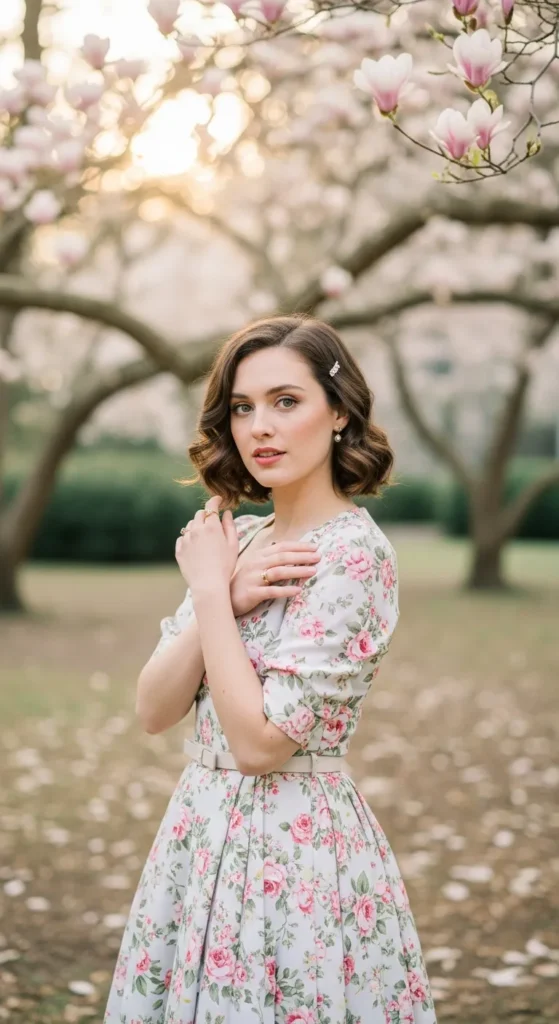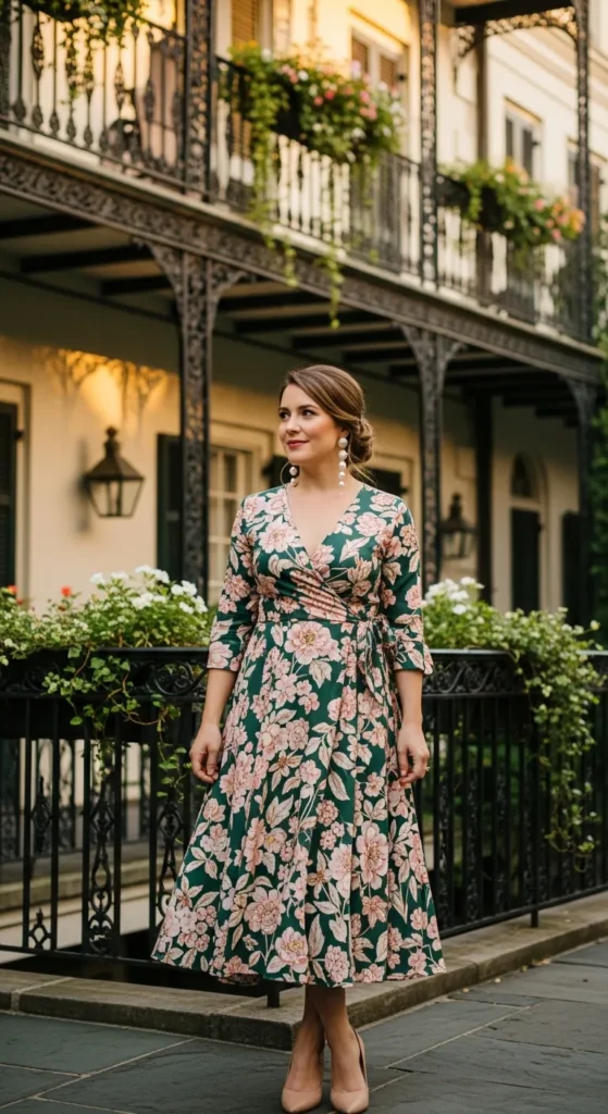 A tea-length floral dress feels timeless against Charleston’s blooming gardens. Soft prints and flowing fabric make it perfect for brunch or garden photos.