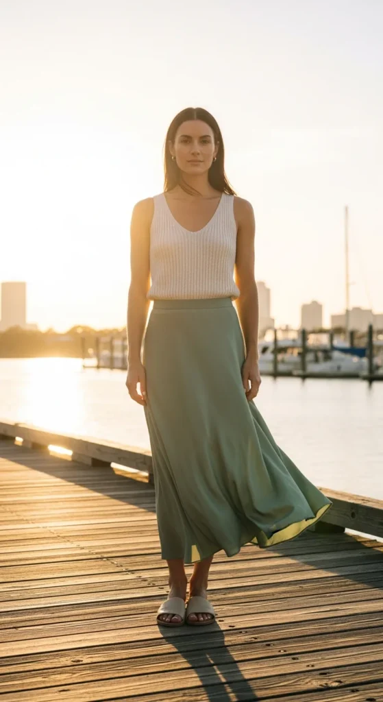 A linen button-front midi skirt paired with a tucked-in sleeveless blouse feels polished yet relaxed. The breathable fabric works beautifully in humid air while maintaining structure.