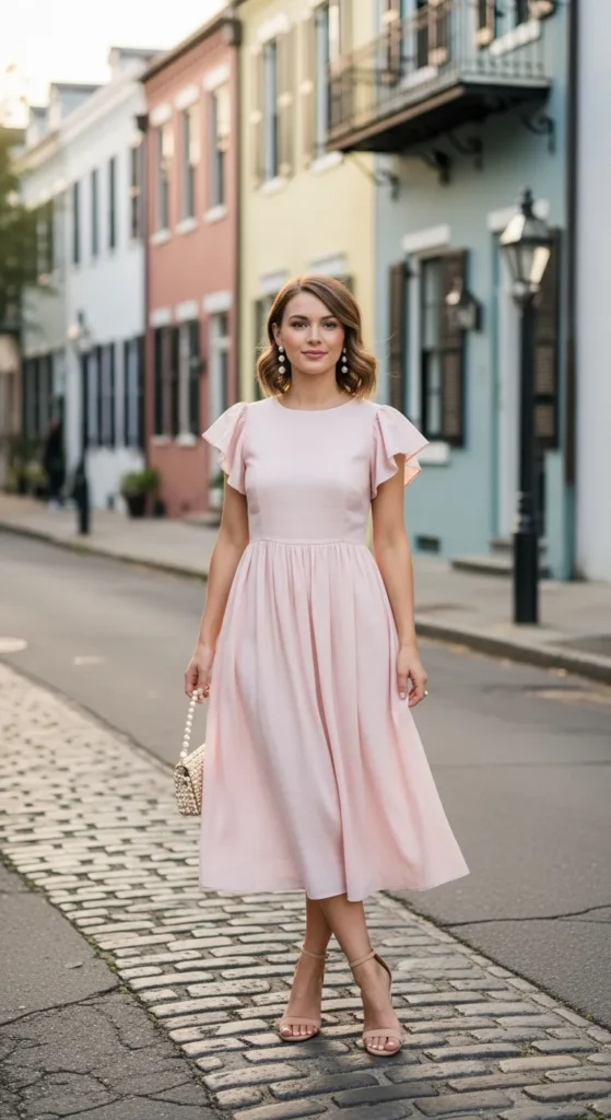 A soft pastel midi dress with flutter sleeves feels perfectly at home against Charleston’s colorful historic homes. It’s light, romantic, and effortlessly polished — ideal for strolling through Rainbow Row or sipping sweet tea outdoors.