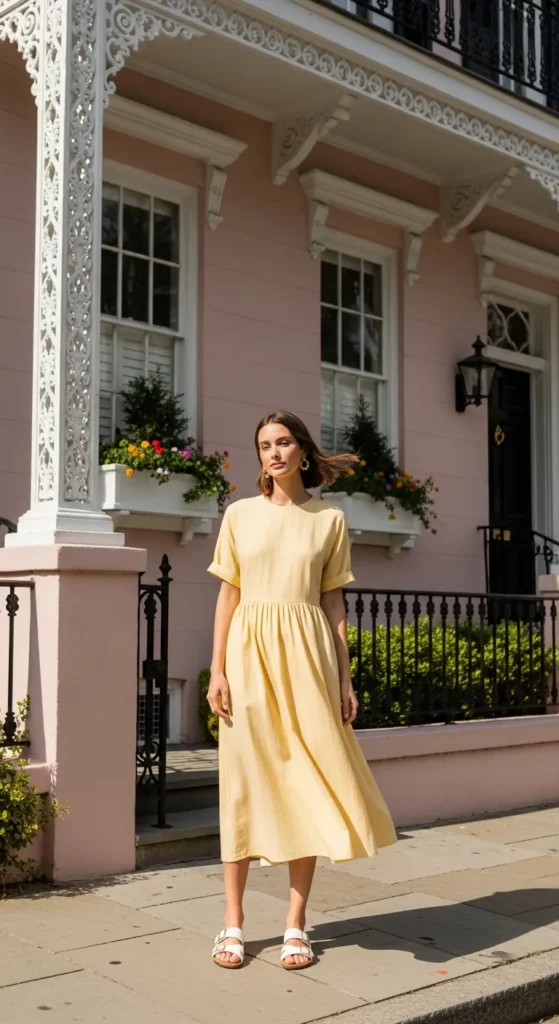 A buttery yellow midi dress radiates warmth against Charleston’s pastel architecture. It feels fresh, youthful, and perfect for sunny afternoons.