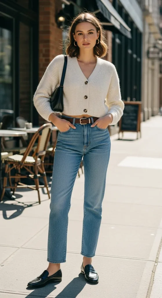 A soft cropped cardigan paired with classic straight-leg denim creates a relaxed yet polished outfit that works for everyday errands or coffee runs. Loafers instantly elevate the casual denim vibe while keeping the outfit comfortable and easygoing.