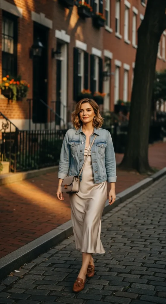 Layering a casual denim jacket over a silky slip dress creates a perfect blend of relaxed and feminine style. Loafers ground the outfit, making the dress feel wearable for daytime instead of overly dressy.
