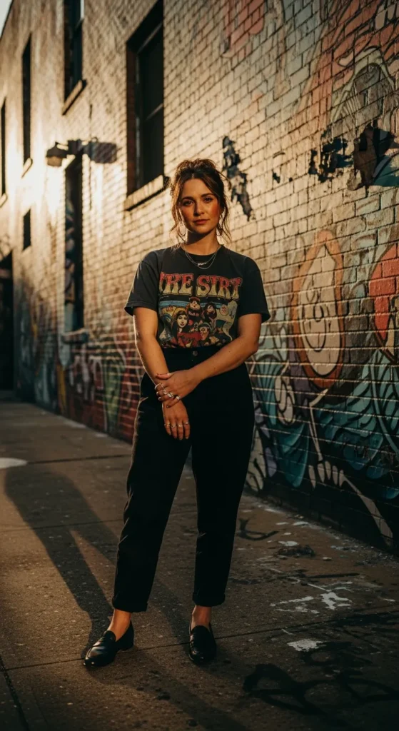 A slightly oversized graphic tee paired with relaxed trousers creates an effortlessly cool everyday look. The loafers keep the outfit looking polished while still allowing the casual tee to bring personality and comfort.
