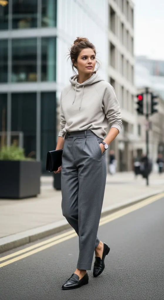 Pairing a casual hoodie with structured trousers creates an interesting contrast between sporty and tailored. Loafers tie the outfit together, making it feel intentional rather than overly relaxed.