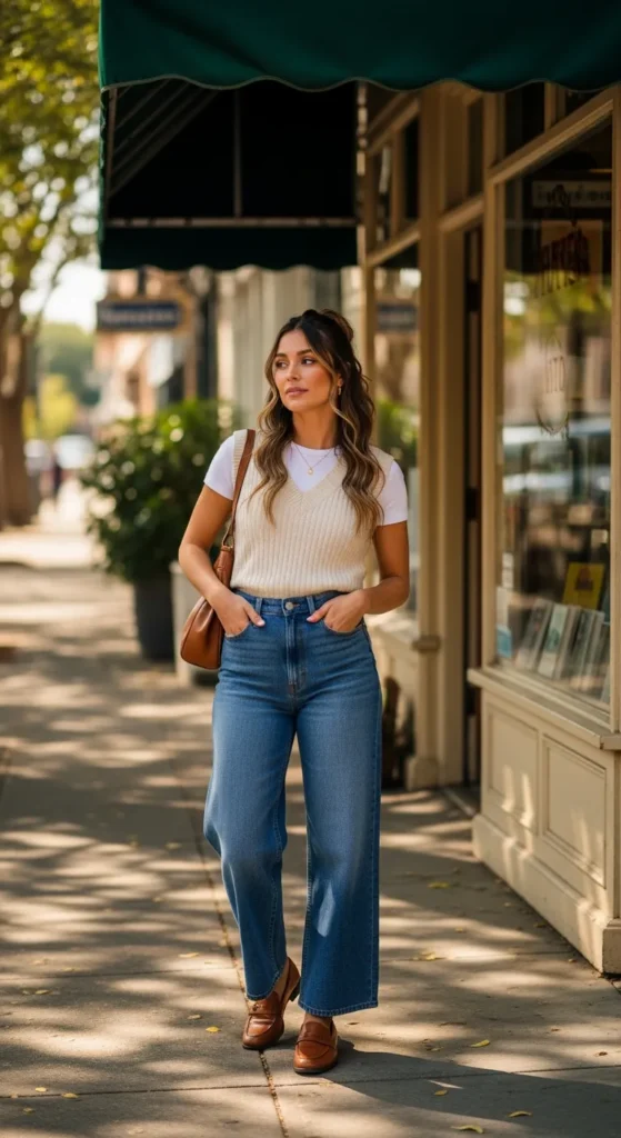 A textured knit vest layered over a simple tee with wide-leg jeans creates a stylish vintage-inspired look. Loafers add the perfect polished finish while keeping the outfit comfortable for everyday wear.