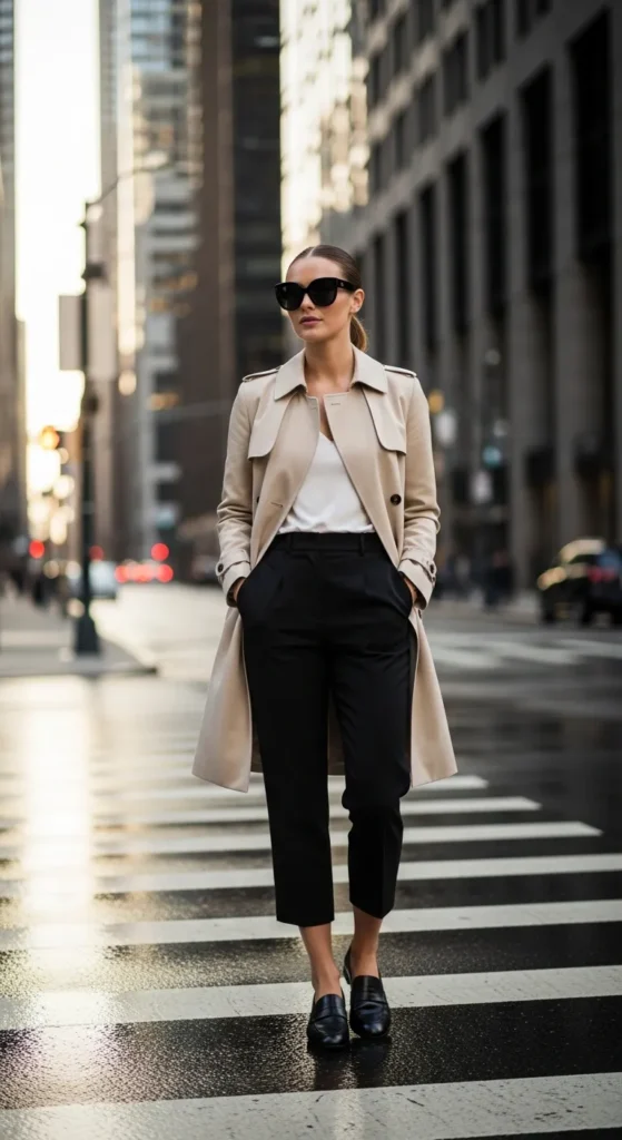 A lightweight trench coat layered over cropped trousers creates an effortlessly refined outfit. Loafers align perfectly with the cropped hem, highlighting the shoes while keeping the silhouette clean and sophisticated.