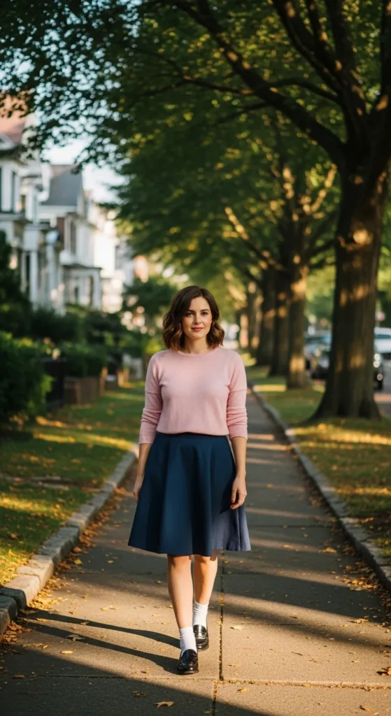A soft lightweight sweater paired with an A-line skirt creates an easy outfit that feels both classic and youthful. Loafers give the look a grounded, preppy edge without making it feel too formal.