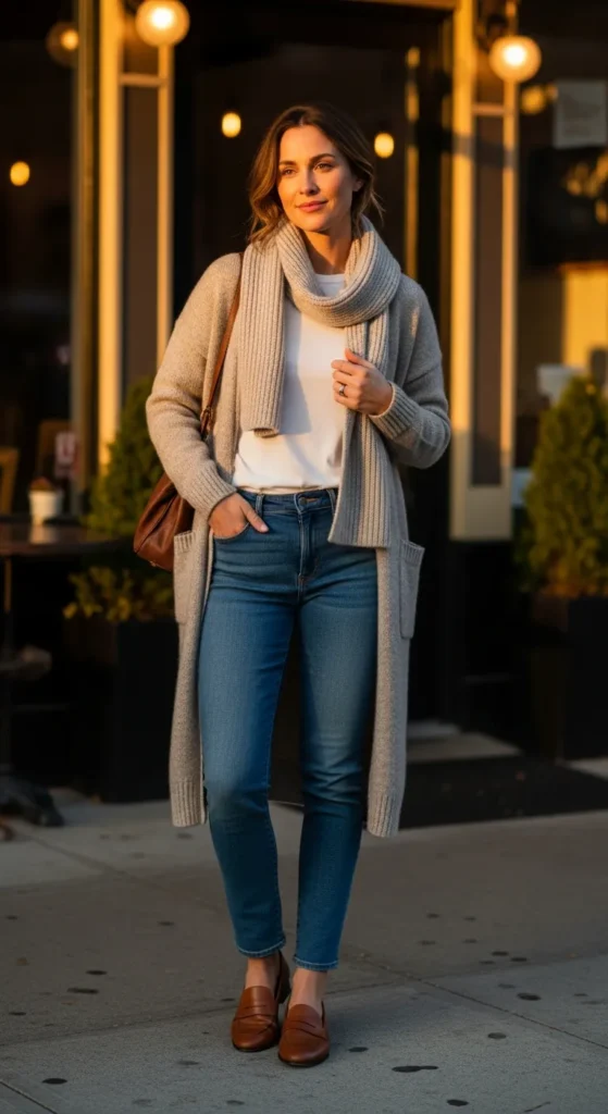 A cozy long cardigan layered over a simple tee and slim jeans creates an easy everyday outfit. Loafers bring just enough structure to keep the look polished without sacrificing comfort.