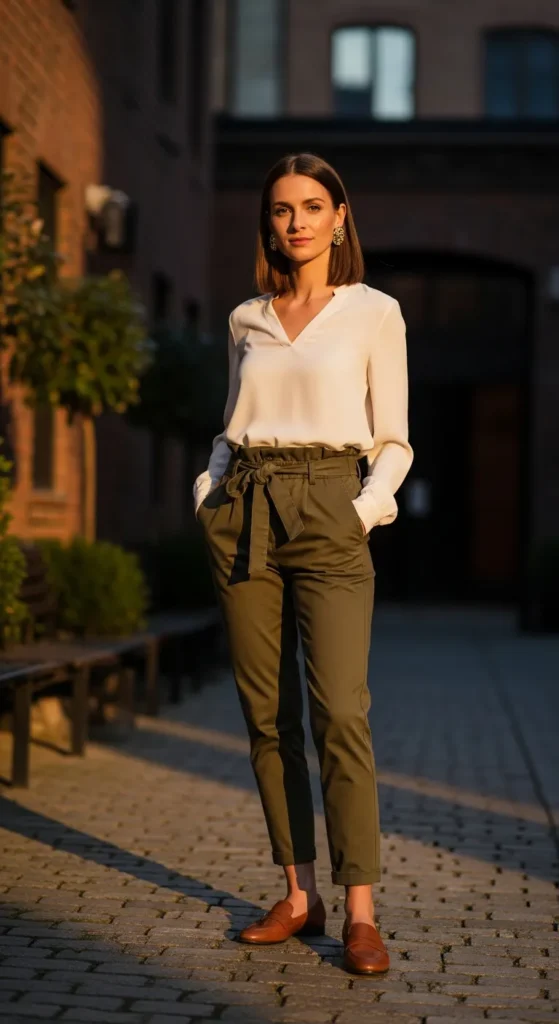 A relaxed blouse tucked into paperbag waist trousers creates a stylish silhouette that feels comfortable yet elevated. Loafers add polish while keeping the outfit perfect for everyday wear.