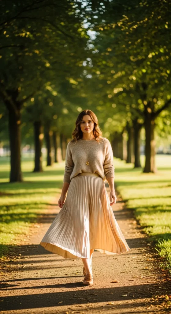 A cozy knit sweater tucked loosely into a flowing pleated midi skirt creates a balanced mix of comfort and elegance. Loafers add structure to the softness, making the outfit feel stylish without being overly dressed up.