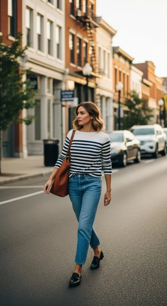 A classic striped long-sleeve top paired with relaxed denim instantly creates that timeless casual style. Loafers bring structure and polish, making the outfit feel effortlessly chic.