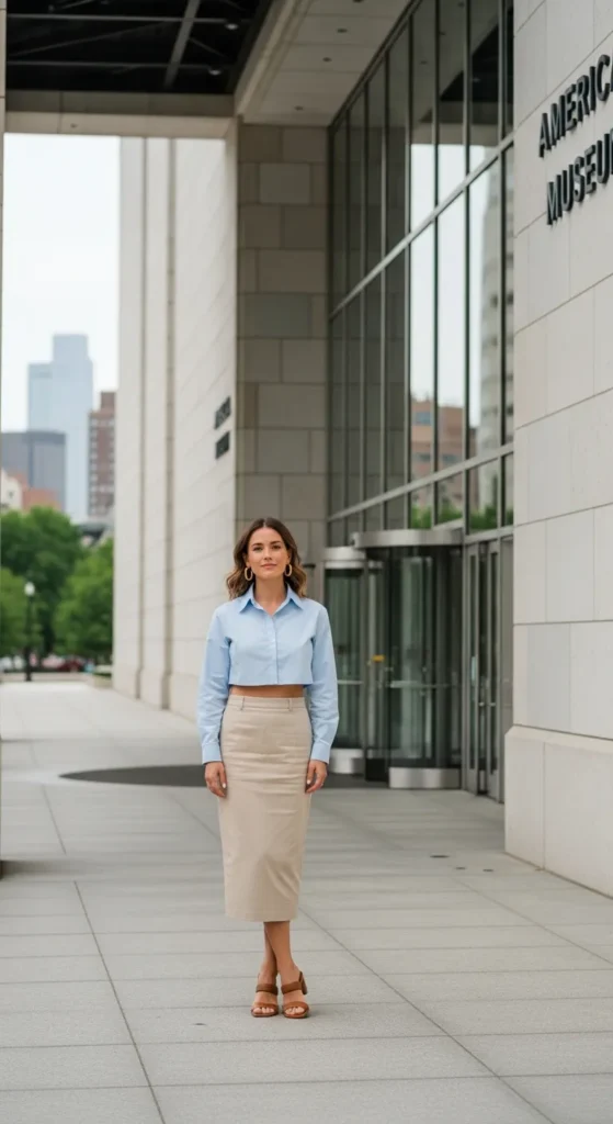 A cropped button-up shirt combined with a high-rise midi skirt creates a polished yet playful summer outfit, ideal for casual dates or museum visits.