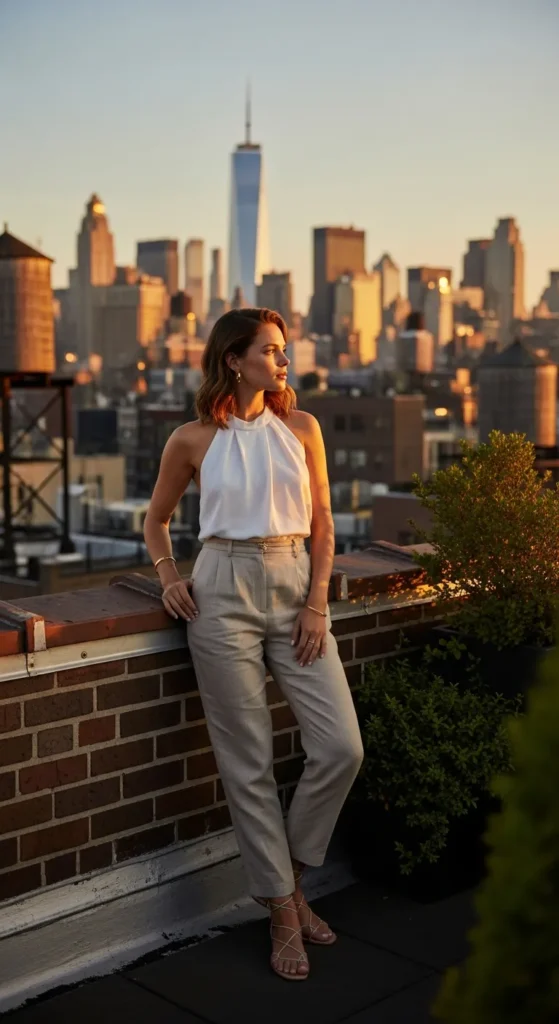 A halter neck top paired with lightweight linen pants creates a sleek yet relaxed summer silhouette, ideal for evening strolls or casual rooftop parties.